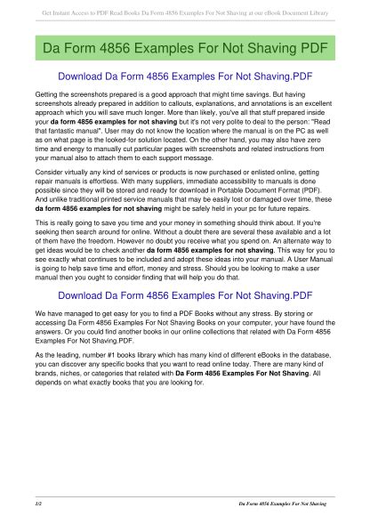 Read da form 4856 examples for not shaving PDF online is a convenient and frugal way to read da form 4856 examples for not shaving you love right from the comfort of your own home. Yes, there sites where you can get PDF "for free" but the ones listed below are clean from viruses and completely legal to use.